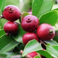 ) is a small, highly-branched tree or large shrub, growing up to 6 meters tall, with glossy green foliage and fragrant white flowers. It produces small, round, reddish-purple fruits with a sweet, strawberry-like flavor, though it can also be yellow depending on the variety. The fruit is eaten fresh or used in jams, jellies, and juices, and the plant is popular in home gardens due to its attractive appearance and relatively low maintenance.