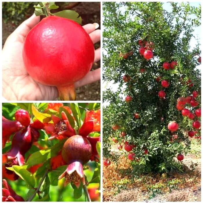 The Super Bhagwa pomegranate plant is a variety known for its large fruit, sweet arils, and high yields. It’s a small pen plant that starts bearing fruit early, even when planted in pots. The fruit is typically red, and the seeds inside are a deep red and very sweet.