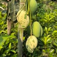 A variegated mango, also known as Chilta Khas, is a mango variety characterized by its leaves with variegated patterns, typically featuring green and yellow or cream shades. The fruit itself also displays a variegated appearance with a mixture of green and yellow skin. This mango variety is known for its sweet flavor and is a popular choice for both ornamental and fruit purposes.