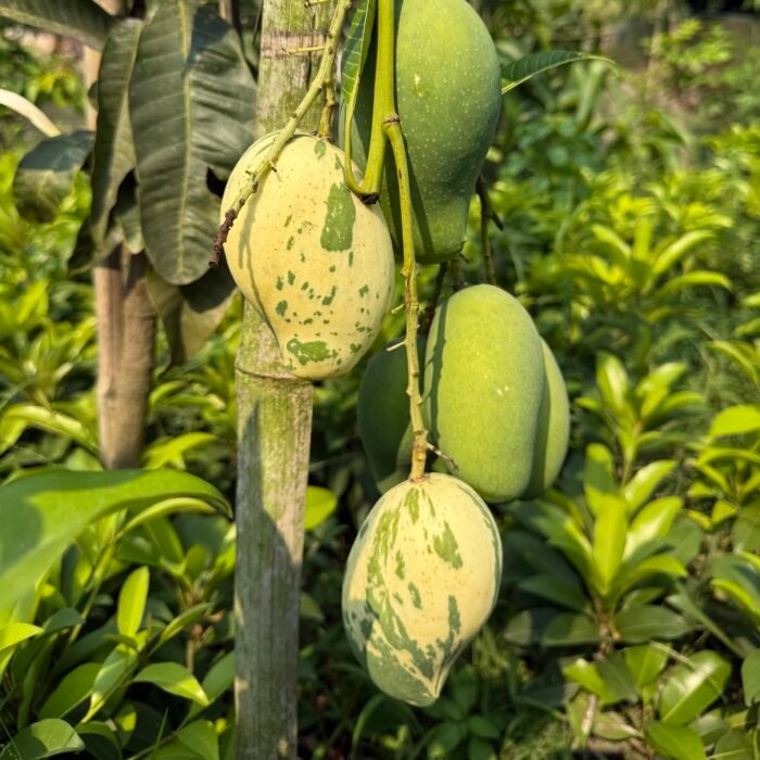 A variegated mango, also known as Chilta Khas, is a mango variety characterized by its leaves with variegated patterns, typically featuring green and yellow or cream shades. The fruit itself also displays a variegated appearance with a mixture of green and yellow skin. This mango variety is known for its sweet flavor and is a popular choice for both ornamental and fruit purposes.