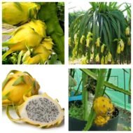 Yellow dragon fruit, also known as yellow pitaya, is a tropical fruit with a vibrant yellow skin and a white, juicy flesh speckled with tiny black seeds. It has a unique, sweet, and slightly tangy flavor, often described as a cross between kiwi and pear. The fruit is smaller than the red dragon fruit and has a slightly sweeter taste.